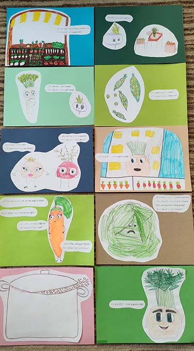Kolejnym naszym zadaniem w projekcie The Power of Reading Books było przygotowanie popularnego w naszym kraju wiersza, historyjki lub opowieści w formie mini komiksu, przetłumaczenie go na język angielski i zaprezentowanie pozostałym partnerom. My wybraliśmy dwa wiersze –„Kaczkę Dziwaczkę” oraz „Na straganie” Jana Brzechwy. Na zdjęciu znajduje się nasza wersja jednego z nich.