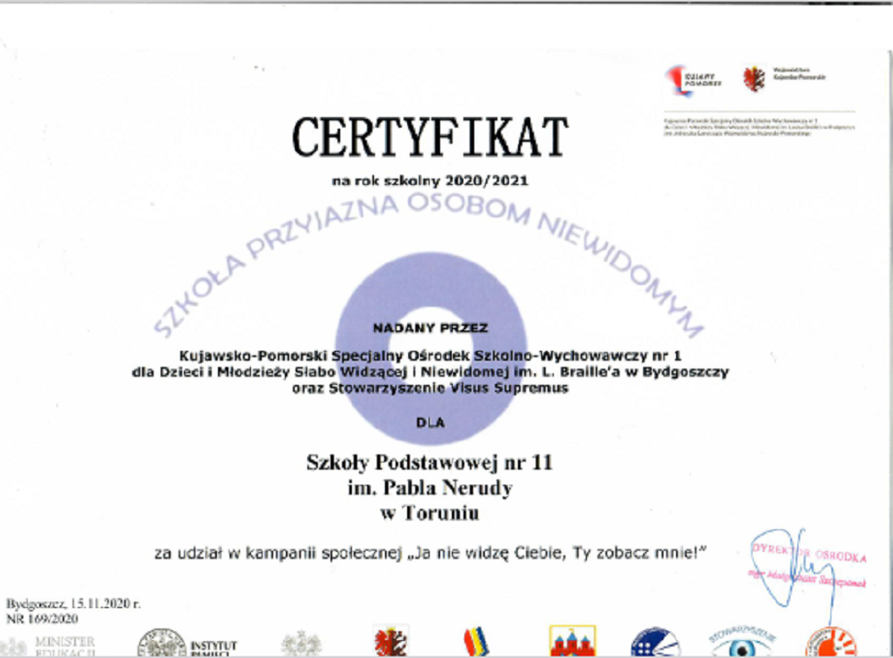 Certyfikat Szkoła przyjazna osobom niewidomym