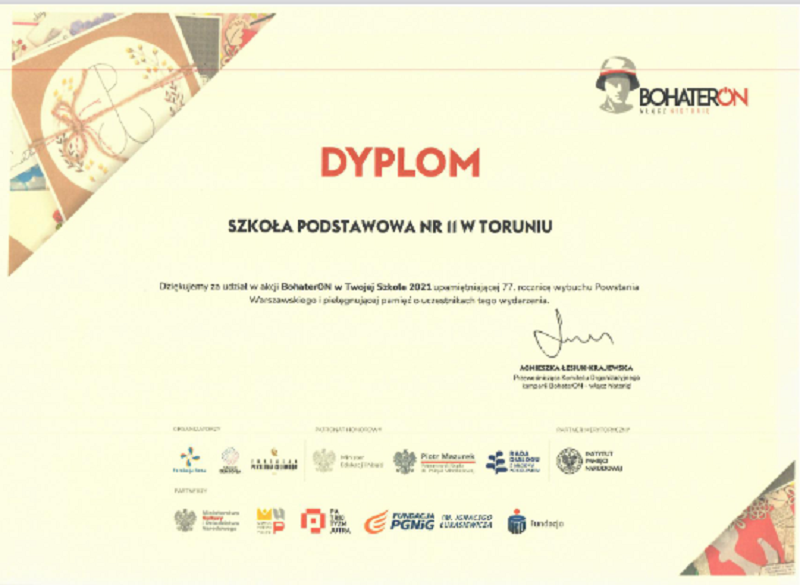 Podziękowanie za udział w akcji BohaterON upamiętniający 78. rocznicę wybuchu Powtania Warszawskiego i pielęgnującej pamięć o uczestnikach tego wydarzenia