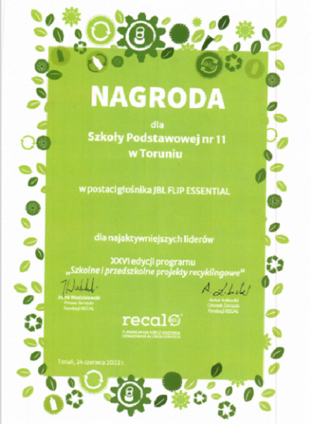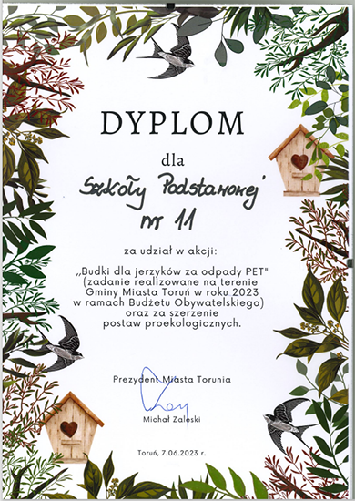 Dyplom za udział w akcji "Budki dla jerzyków za odpady PET"