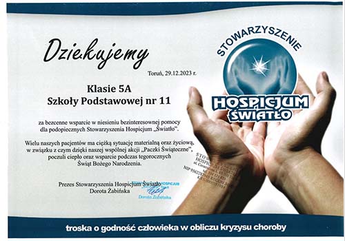 Podziękowanie za wsparcie w niesieniu pomocy dla podopiecznych Stowarzyszenie Hospicjum Światło
