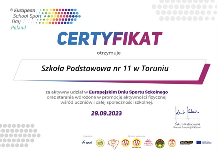 Certyfikat za aktywny udział w Europejskim Dniu Sportu Szkolnego i starania włożone w promocję aktywności fizycznej wśród uczniów i całej aktywności szkolnej