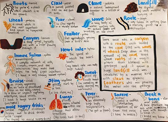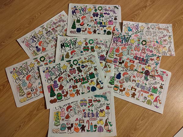 Uczniowie, a właściwie uczennice klasy 4 i 5 pokolorowały projekt (aut. A. Jachymek) kartki świątecznej, która jednocześnie jest wspaniałą notatką ze słownictwem bożonarodzeniowym. Paulina z 4a zrobiła to tak świetnie, że postanowiliśmy, by właśnie Jej praca została powielona i wysłana wraz z życzeniami do naszych partnerów z Turcji, Holandii, Chorwacji, Słowacji, Estonii, Hiszpanii i Północnej Macedonii.