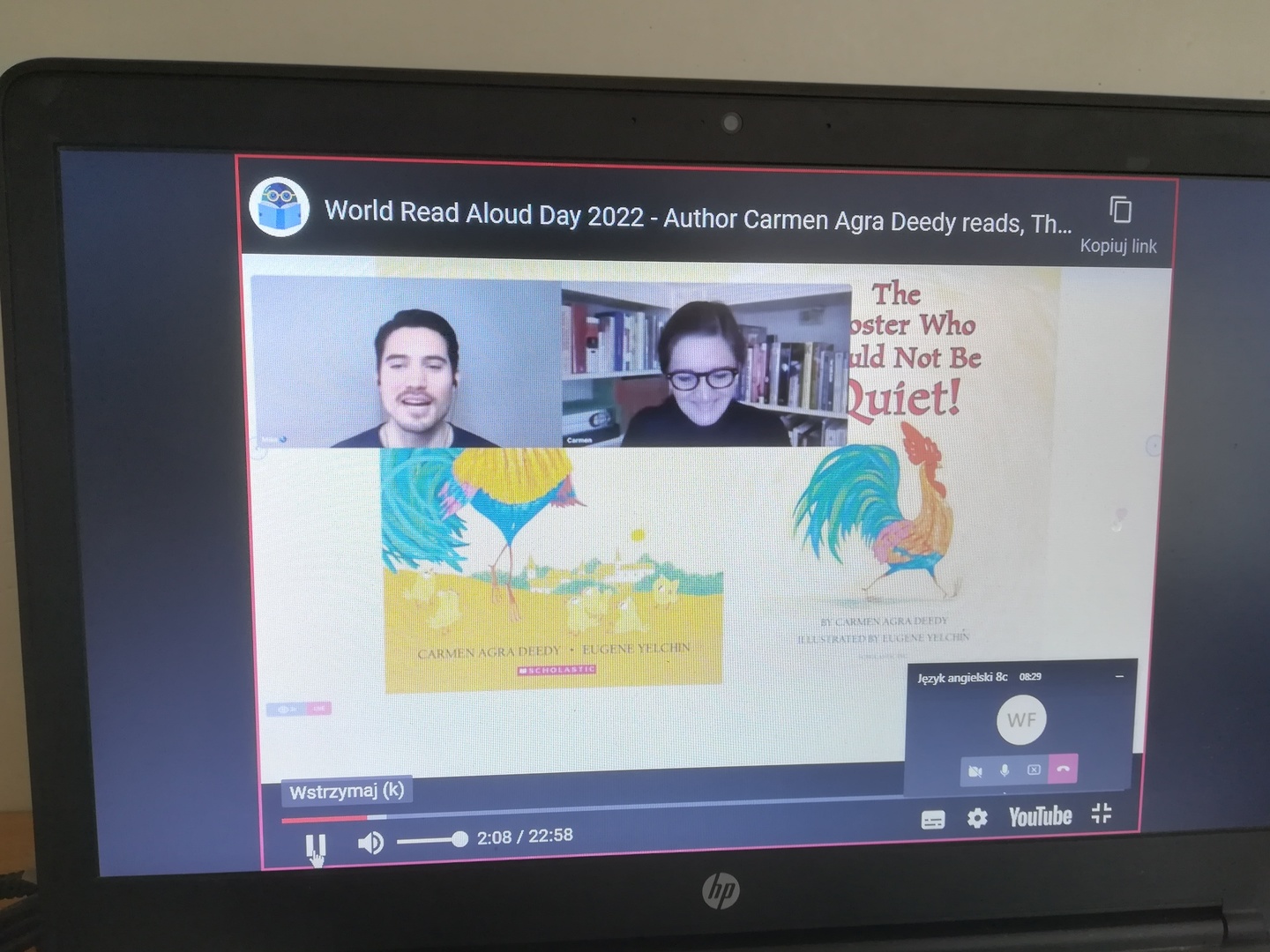 Już drugi rok z rzędu świętujemy WORLD READ ALOUD DAY w nieco zmienionej formie. Co to za dzień? To Światowy Dzień Głośnego Czytania. I to po angielsku! W tym roku starsze klasy w czasie lekcji online mogły posłuchać fragmentów książek dla dzieci czytanych przez samych autorów ze Stanów Zjednoczonych. Klasy czwarte przez chwilę uczestniczyły w tych spotkaniach online w szkole. Okazało się, że książki napisane w obcym języku wcale nie są trudne do zrozumienia! Zachęcamy więc do czytania! Pamiętajcie, że w naszej szkolnej bibliotece jest cała seria prostych historii i lektur w języku angielskim. Wypożyczajcie i czytajcie!