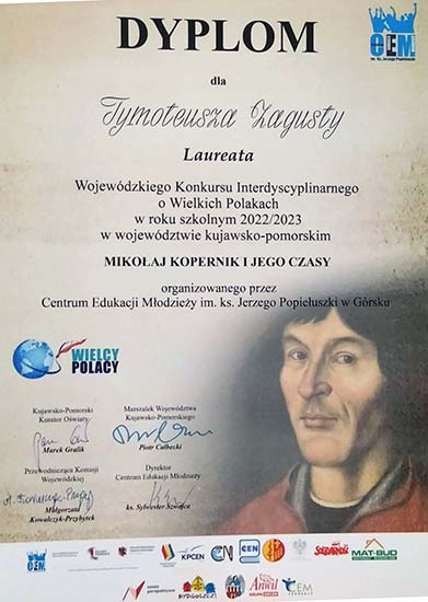 Tymoteusz Zagusta uczeń kl. 8a został Laureatem Wojewódzkiego Konkursu Interdyscyplinarnego o Wielkich Polakach. W bieżącym roku szkolnym temat konkursu to: "Mikołaj Kopernik i jego czasy". Konkurs od 11 lat organizowany jest przez Centrum Edukacji Młodzieży w Górsku. Poniżej fotorelacja z dzisiejszej Gali wręczenia dyplomów i nagród. Brawo Tymek!!! wielkie gratulacje. Przygotowania do konkursu przebiegały pod czujnym okiem Pani Marii Narczewskiej - dziękujemy!!!