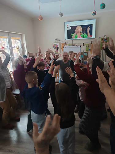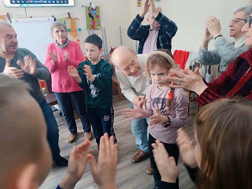 Dzieci wręczyły przygotowane upominki i pyszną drożdżówkę, upieczoną w szkolnej Pracowni Smaków. Wspólne zabawy i tańce sprawiły wszystkim wiele radości. Seniorzy z zainteresowaniem wysłuchali dziecięcych opowieści o szkole, a uczniowie podziwiali ich rękodzieło