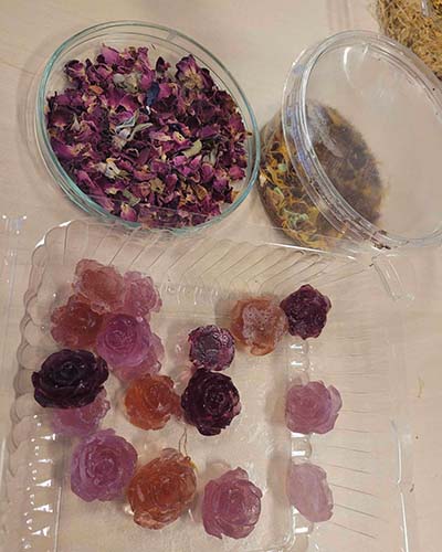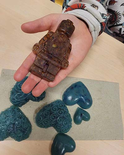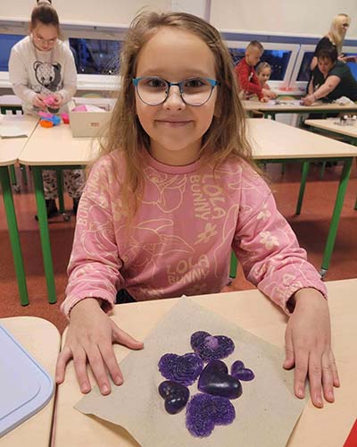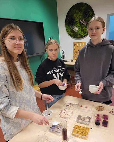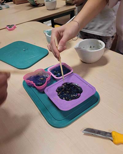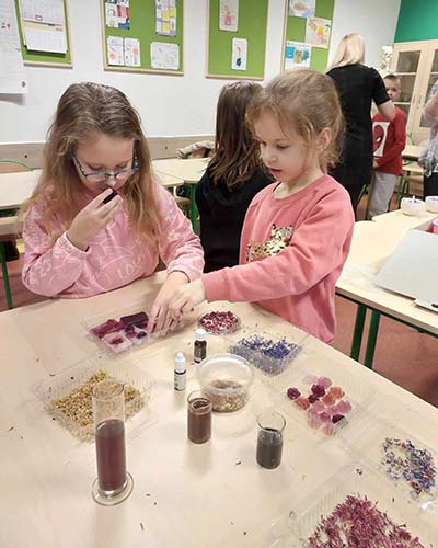 Połączyliśmy zabawę i naukę wykonując samodzielnie mydła. Używaliśmy tylko naturalnych barwników pozyskanych z płatków kwiatów, korzeni, przypraw kuchennych.