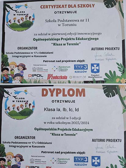 Uczniowie wszystkich klas pierwszych zakończyli realizację Ogólnopolskiego Projektu Edukacyjnego "Klasa w terenie". Celem projektu było promowanie wartości edukacji na świeżym powietrzu. Nauka w terenie to ulubiona forma poznawania świata przez dzieci. Rozbudza ciekawość, angażuje wszystkie zmysły oraz mobilizuje do twórczych rozwiązań. Potwierdzeniem naszych dokonań jest uzyskanie certyfikatu z realizacji projektu.![]()