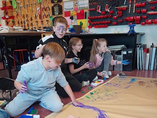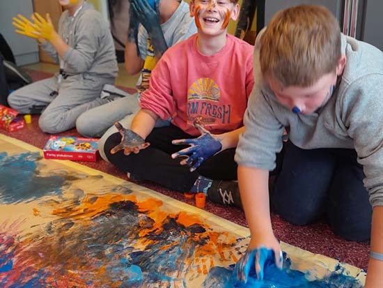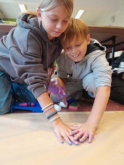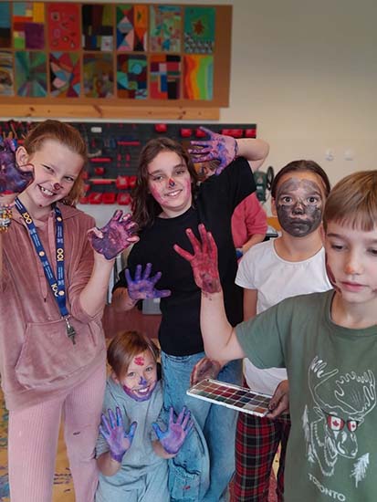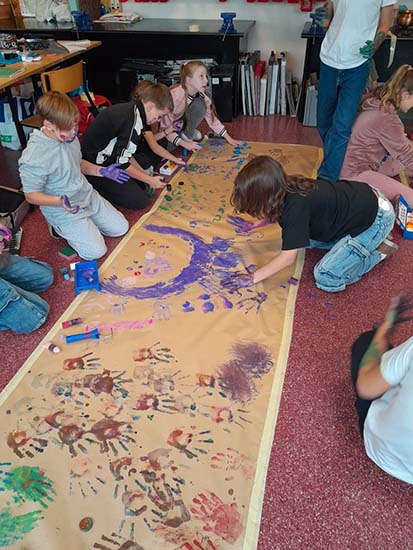 Zabawa farbami w klasie 5a stała się podstawą do rozmowy o sztuce i artystach. Picasso powiedział, że każde dziecko jest artystą. Pytanie, jak nim pozostać, gdy dorastamy..... Dziecko chce poznawać świat i od momentu urodzenia poznaje go wszystkimi zmysłami. Obserwuje, bada, sprawdza, podpatruje, uczy się, tworzy, psuje i znów buduje. Tworzenie sztuki jest pokrewne zabawie. Uczniowie odkryli, że każdy z nich może coś stworzyć i jak wiele emocji i frajdy przyniosło im malowanie rękami bez żadnych ograniczeń ![]()