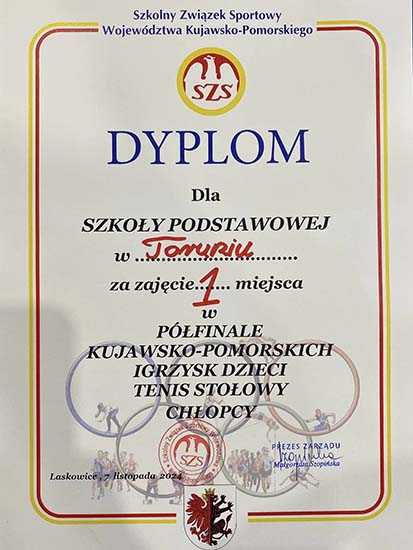 Dnia 07.11.24 reprezentacja naszej szkoły w składzie: Stepan Volkov, Krzysztof Dziuba, Kacper Królak oraz trener Radosław Plebanek pojechała do Laskowic, aby rywalizować w półfinałach województwa Kujawsko Pomorskiego w tenisie stołowym