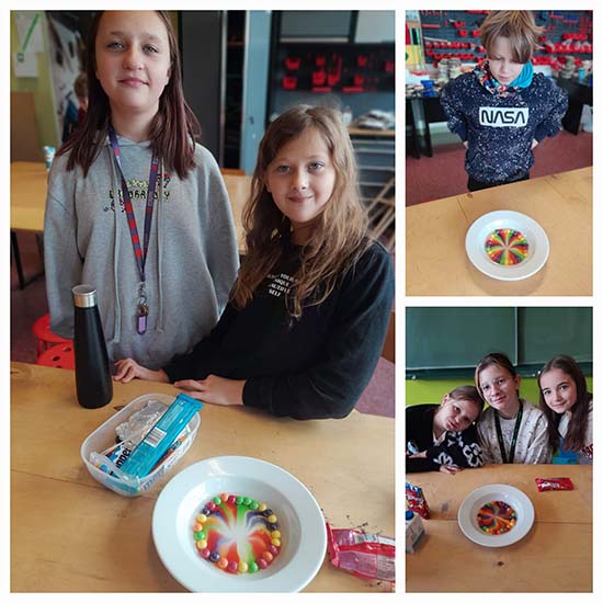 Jak powstaje tęcza , jak mieszają się barwy, czy jedzenie jest sztucznie barwione? Dzieci każdego dnia zadają tysiące pytań. Tym razem wykonały prosty eksperyment, który był zaskakującym wprowadzeniem do dłuższej rozmowy o kolorach wokół nas, zdrowym odżywianiu i minusów sztucznej żywności przepełnionej cukrem i barwnikami, które rozpuszczają się po zjedzeniu w naszym organizmie. Natomiast inną zabawą plastyczną dla dzieci