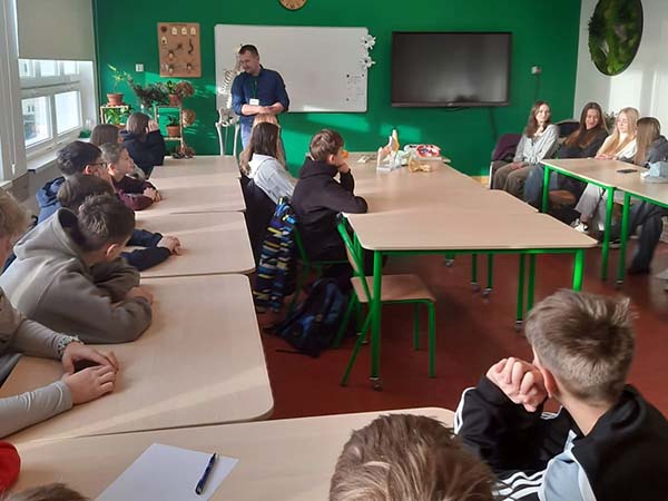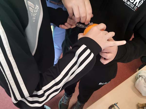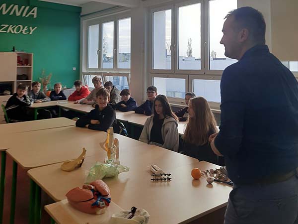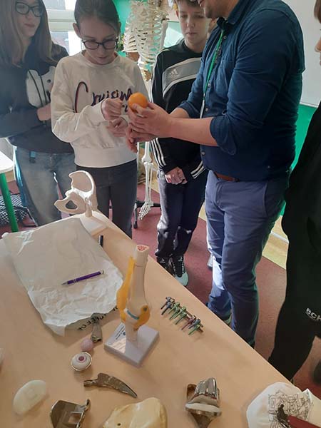 W piątek odwiedził nas Pan ortopeda. Przeprowadził bardzo ciekawą lekcję anatomii układu szkieletowego człowieka. Uczniowie klasy 7 składali stawy biodrowe, kolanowe. Skręcali śruby usztywniające złamane kości. Ćwiczenia odbywały się na...mandarynce.