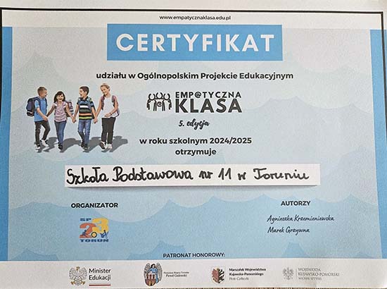 Z radością informujemy, że uczniowie wszystkich klas drugich naszej szkoły, wzięli udział w ogólnopolskim projekcie „Emp@tyczna Klasa”, którego celem było rozwijanie wśród uczniów empatii, wrażliwości społecznej oraz umiejętności współpracy i wspierania się nawzajem. W ramach projektu realizowaliśmy działania sprzyjające budowaniu pozytywnego klimatu w klasach, uczyliśmy się, jak rozpoznawać i rozmawiać o emocjach, rozwiązywać konflikty oraz okazywać zrozumienie innym. Uczniowie brali udział w zajęciach warsztatowych, tworzyli plakaty, brali udział w zabawach integracyjnych i wspólnych inicjatywach. Wierzymy, że dzięki projektowi dzieci nauczą się, że empatia to nie tylko uczucie, ale codzienna postawa, która pomaga budować lepszy świat. Jesteśmy dumni, że mogliśmy być częścią tego wartościowego przedsięwzięcia. Wierzymy, że zdobyte doświadczenia pozostaną z nami na długo i będą owocować w codziennym życiu szkolnym.